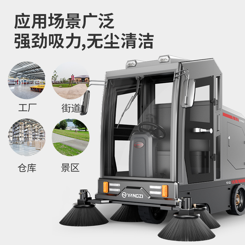 揚子YZ-S11駕駛式掃地機配備簡單易掌握的控制面板,采用真空吸塵方式,解決了設備操作過程中噪音過大的問題;配備四組減震裝置,改善了清掃過程中的揚塵問題。設備清掃寬度升級